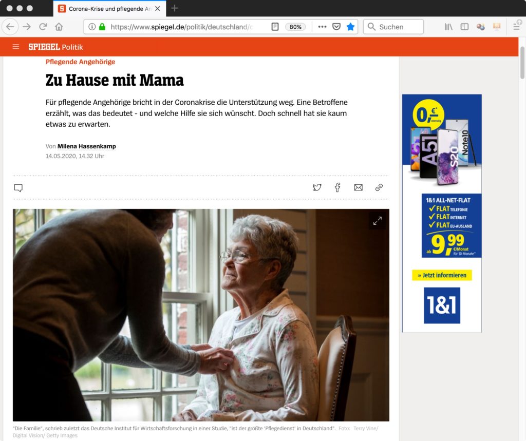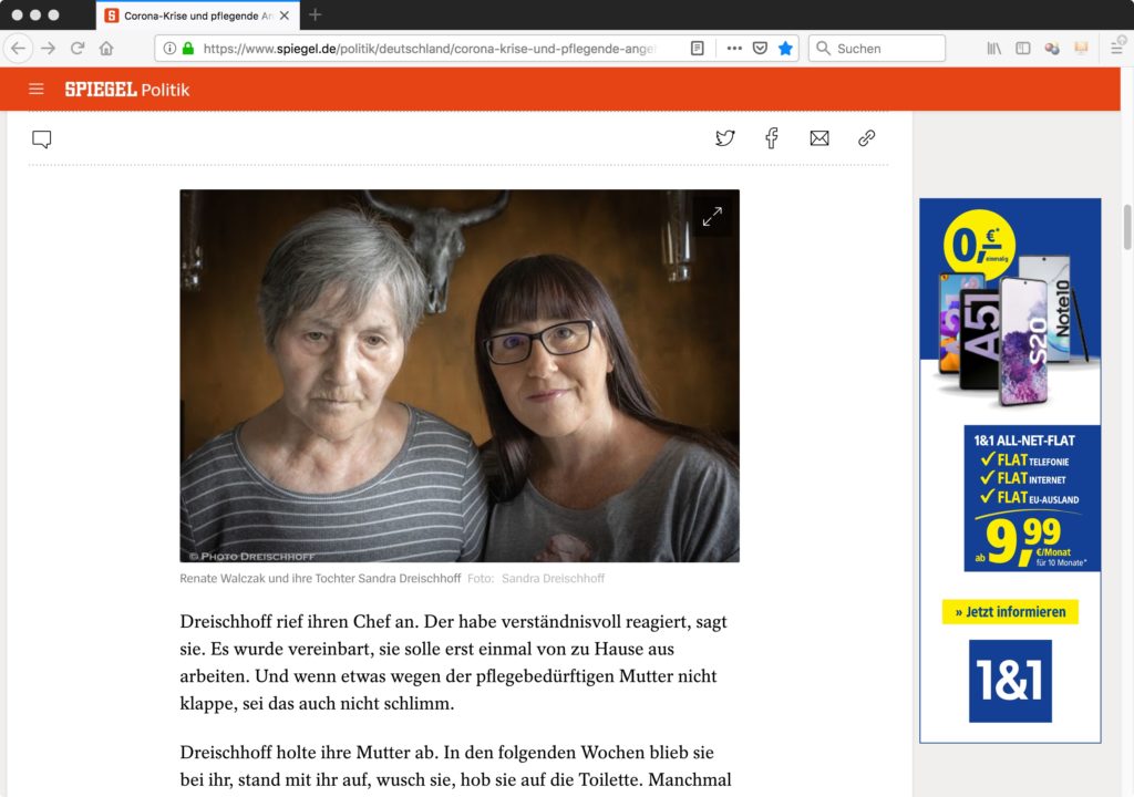Am 14. Mai 2020 wurde auf dem Onlineportal des Nachrichtenmagazins „Der Spiegel“ der Artikel „Zu Hause mit Mama“ der Autorin Milena Hassenkamp publiziert. Thema war die weggefallene Unterstützung für pflegende Angehörige in der Coronakrise sowie die Suche nach staatlicher Hilfestellung. Als Aufmacherbild wurde eine Fotografie gewählt, die eine ältere Frau auf einem Stuhl vor einer Holzwand zeigt, der von einer zweiten Person im Anschnitt die Pyjama-Jacke zugeknüpft wird. Erleuchtet wird die Szene durch Tageslicht, welches durch das Kassettenfenster am linken Bildrand fällt. Als Quelle wird „Terry Vine/Digital Vision/Getty Images“ angegeben. Weiter unten im Text gibt es ein zweites Bild, eine private Fotografie, auf der die Protagonist*innen des Artikels, Renate Walczak und ihre Tochter Sandra Dreischhoff zu sehen sind.