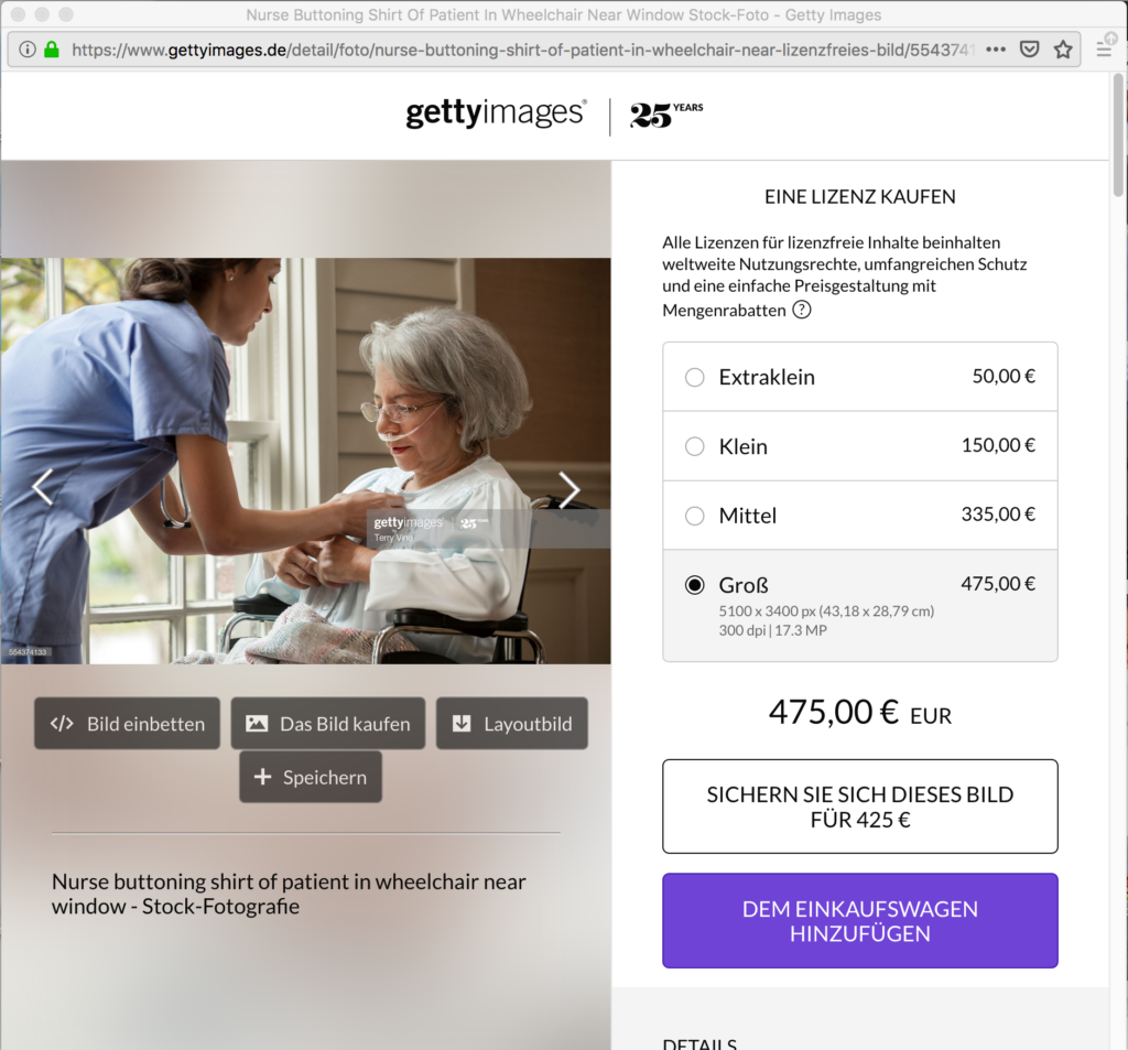 Dass dies eine Fehlinterpretation ist, darauf weist die zweite Fotografie weiter unten im Artikel hin über die im Vergleich schnell sichtbar wird, das im Aufmacherbild andere Personen zu sehen sind. Um zu wissen wer diese sind, ist eine Recherche des Originalbildes in der Datenbank der Agentur Getty Images notwendig, wo es auch auffindbar ist. Dort wird das Bild als Stockfotografie mit der Caption „Woman buttoning pajamas of mother near window“ vertrieben. Stockfotografie bedeutet, dass es sich in der Regel um Modelle handelt, die für bestimmte Szenen posieren und nicht mit realem Namen genannt werden. Über eine Suche nach weiteren Fotografien des Fotografen wird das Arbeitsprinzip der Stockfotografie deutlich. Denn vor dem gleichen Hintergrund der Holzwand und des Kassettenfensters finden sich Aufnahmen von Personen zu anderen Themenfeldern am gleichen Ort (Siehe unten stehendes Bild). Diese sollen laut Caption eine Krankenschwester und eine Patientin visualisieren.