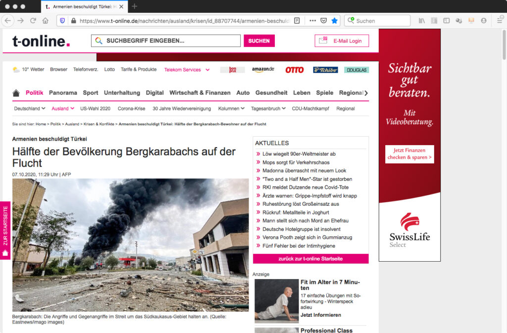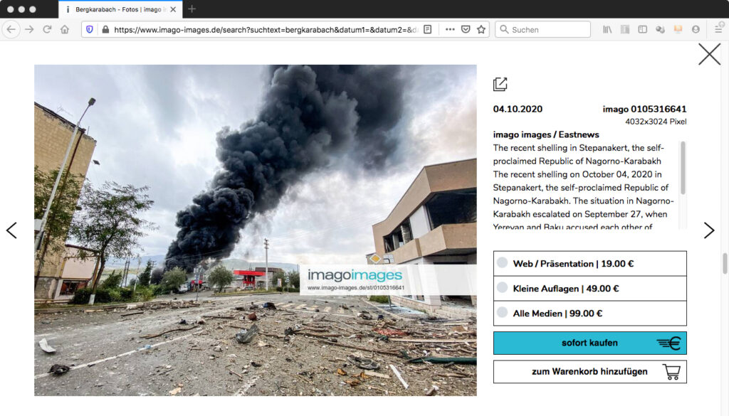 Seit Ende September ist die Eskalation in der Region Bergkarabach zwischen Armenien und Aserbaidschan immer wieder Thema in den deutschen Abendnachrichten. Das Onlineportal T-Online veröffentlichte dazu am 7. Oktober um 11:29 einen kurzen Beitrag unter dem Titel „Hälfte der Bevölkerung Bergkarabachs auf der Flucht“, der auf Material der Nachrichtenagentur AFP fußte. Dazu wurde ein extrem weitwinklig aufgenommenes Bild publiziert, welches einen leeren, mit Trümmerteilen übersäten Straßenzug zeigt, während am Hintergrund eine schwarze Rauchsäule in den Himmel steigt. Als Bildquelle ist Eastnews/imago images angegeben. In der Bildunterzeile heißt es „Bergkarabach: Die Angriffe und Gegenangriffe im Streit um das Südkaukasus-Gebiet halten an“.