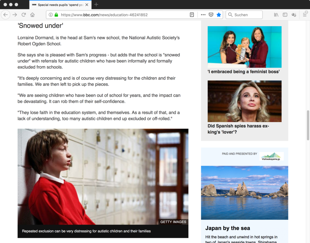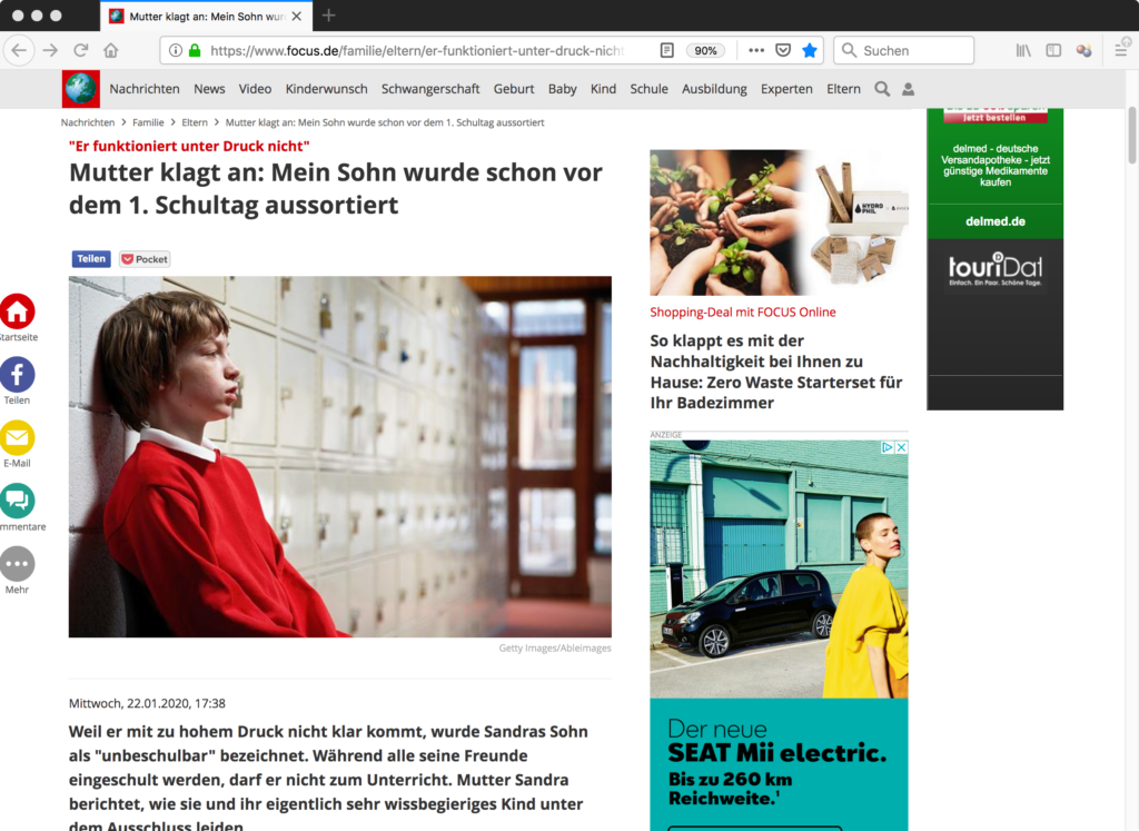 Unter dem Titel „Mutter klagt an: Mein Sohn wurde schon vor dem 1. Schultag aussortiert“ veröffentlichte FOCUS Online am 22. Januar 2012 in der Rubrik Eltern, die in Kooperation mit „netmoms“ betrieben wird, ein Interview mit einer Mutter Namens Sandra. Es geht um Sandras Sohn, dem wegen vermeintlicher „Unbeschulbarkeit“ die Einschulung verweigert wurde. Eingeleitet wird der Text von einem Bild der Agentur Ableimages im Vertrieb von Getty Images, das am linken Bildrand einen Jungen im roten Pullover zeigt, der sich an eine Wand von Schließfächern lehnt. Die Schließfächer laufen nach hinten rechts zu und enden in Unschärfe an einer Tür.