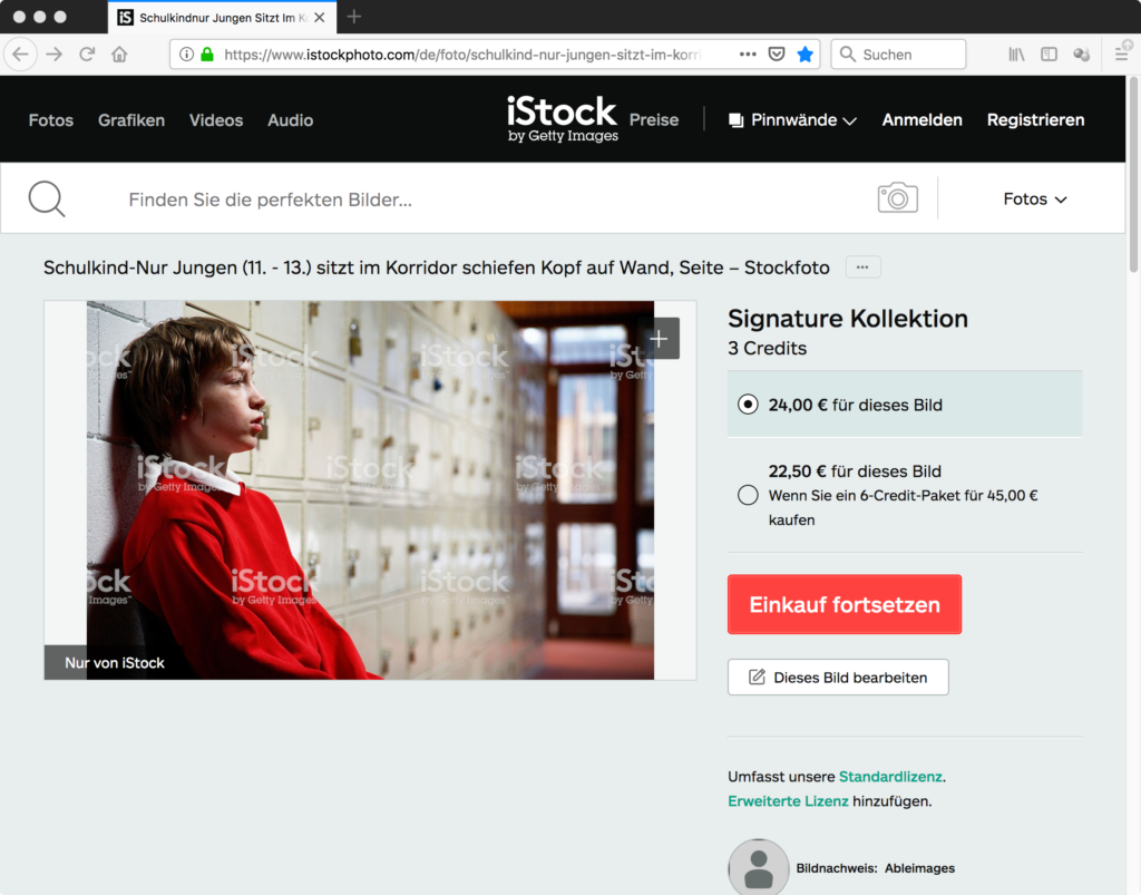 Nur eine Recherche des Ausgangsmaterials kann klären, ob es sich um Sandras Sohn oder einen beliebigen Jungen handelt, auch wenn die Agenturnamen bereits auf die zweite Hypothese hindeuten. Es ist jedoch davon auszugehen, dass vielen Medienkonsument*innen die Bedeutung der Namen nicht bekannt ist. Zu finden ist das Bild bei iStock, der Stockfoto-Agentur von Getty Images. Dort ist das Bild unter dem Stichwort „Schulkind“ zu finden. Es ist Teil einer Serie mit weiteren Bildern, die den Jungen in ähnlichen Posen und Situationen zeigt und im Jahr 2011 hochgeladen wurde.