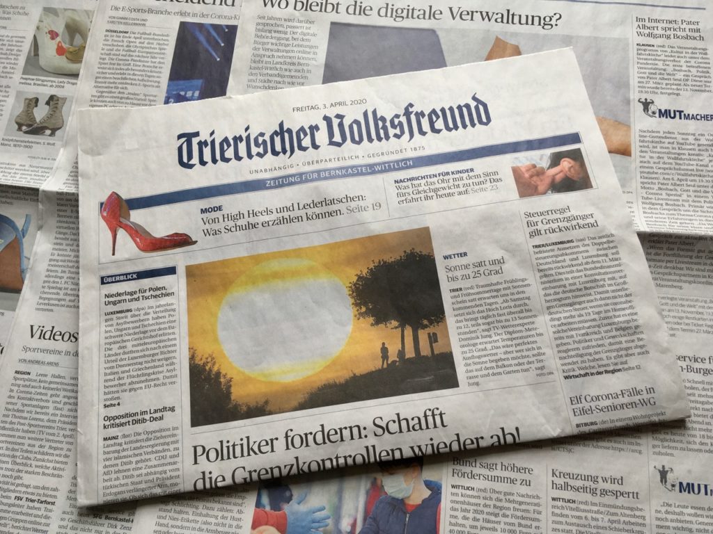 Die Ausgabe der Lokalzeitung „Trierischer Volksfreund“ hat am 3. April 2020 einen Umfang von 24 Seiten, verteilt auf 4 Bücher. Im Mantelteil finden sich die Rubriken Politik, Schwerpunkt, Themen des Tages, Geld und Markt sowie Aus aller Welt. Das zweite Buch ist dem Sport, das dritte Buch Lokalthemen und das vierte Buch der Kultur gewidmet. Der TV macht mit einem dreispaltigen Symbolfoto der Agentur dpa und einem Beitrag über das zu erwartende schöne Wetter am 1. Aprilwochenende auf. Der zentrale Artikel ist der Corona-Krise gewidmet und verweist auf die weitere diesbezügliche Berichterstattung im Blatt.