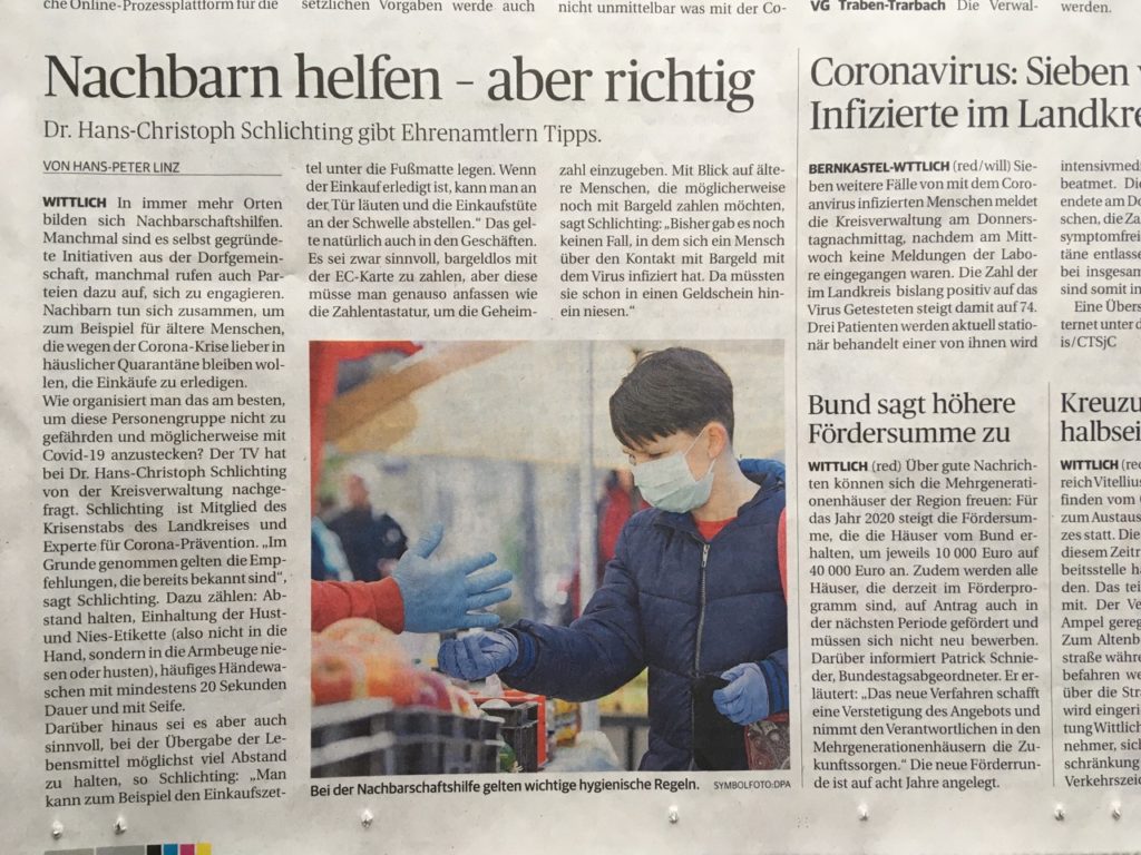 In der Ausgabe vom 03. April ist die Verwendung des Begriffs Symbolfoto interessant. Auf der Aufmacherseite des Lokalteils von Bernkastel-Wittlich etwa ist im unteren Drittel ein Bild von dpa einer Person mit Atemschutzmaske an einem Marktstand als Visualisierung eines Artikels über Nachbarschaftshilfe verwendet worden und mit dem Credit „Symbolfoto/dpa“ versehen. Dies ist, trotz des Verzichts auf die Nennung des Fotografen, positiv zu vermerken. Auf der gleichen Seite findet sich jedoch in der oberen Hälfte ein weiteres dpa Foto, das eine Person vor einem Laptop zeigt und einen Artikel über die digitale Verwaltung in der Region visualisiert. Hier wurde interessanterweise auf den Zusatz Symbolfoto verzichtet. Ähnliches zeigt sich auch bei einem Artikel auf Seite 12, was inkonsequent wirkt.