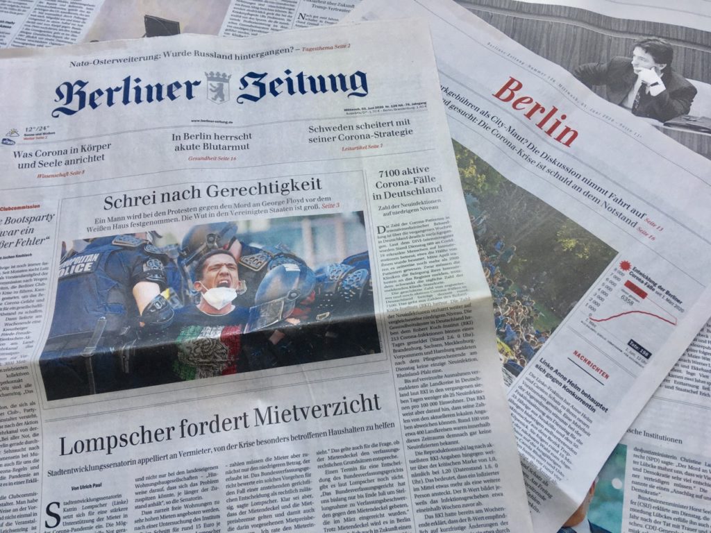 Die Ausgabe der „Berliner Zeitung“ vom 3. Juni 2020 umfasst 20 Seiten, verteilt auf zwei Bücher. Im Buch eins finden sich die Rubriken Tagesthema, „Seite 3“, Politik, Wirtschaft, Meinung, Wissenschaft und Sport. Das zweite Buch startet mit dem Ressort Berlin, gefolgt von Brandenburg, Gesundheit, Feuilleton, TV Programm und Panorama. Die Titelseite ist zweigeteilt in Aufmacherbild und Aufmacherartikel. Das Aufmacherbild in der oberen Hälfte zeigt die Verhaftung eines Schwarzen Demonstranten in den USA während der Aufmacherartikel auf der unteren Hälfte sich dem lokalen Mietenmarkt in Berlin widmet.