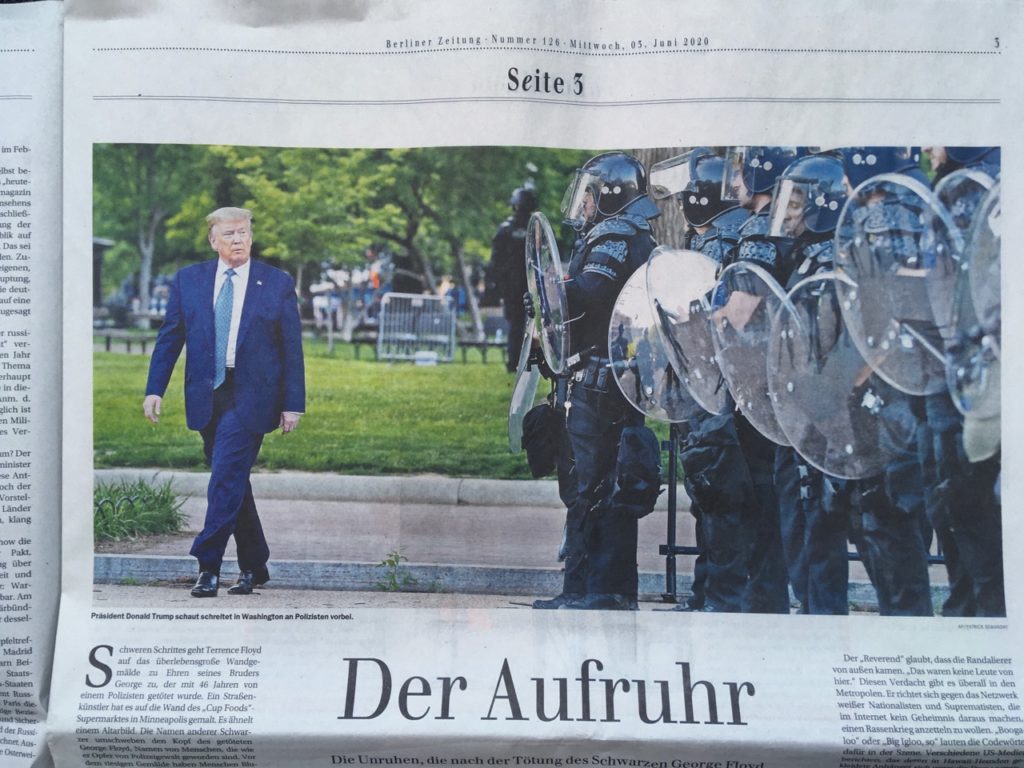 Interessant an der Ausgabe vom 3. Juni 2020 ist die Gestaltung der „Seite 3“. Die Rubrik ist für ausführliche Hintergrundreportagen reserviert. Am Untersuchungstag fand sich dort eine Reportage des freien USA Korrespondenten Thomas Spang über die Unruhen nach der Tötung des Schwarzen US Bürgers George Floyd. Betitelt mit „Der Aufruhr“ wird der Artikel von einer querformatigen Fotografie begleitet, die das obere Drittel der Zeitungsseite einnimmt und über die komplette Breite geht. Sie zeigt Donald Trump wie er in Washington an Polizisten vorbeischreitet. Dieser Fokus auf den amerikanischen Präsidenten lässt stutzig machen, geht es doch im Artikel viel stärker um die Familie von Floyd und die Proteste auf der Straße. Floyds Familie bekommt nur auf der unteren Seite durch ein kleines Porträt des Bruders ein Gesicht. Die Fotografie von Trump fungiert gleichwohl auch als Gegengewicht zum Aufmacher auf der Titelseite, das die Verhaftung eines Schwarzen Demonstranten zeigt.