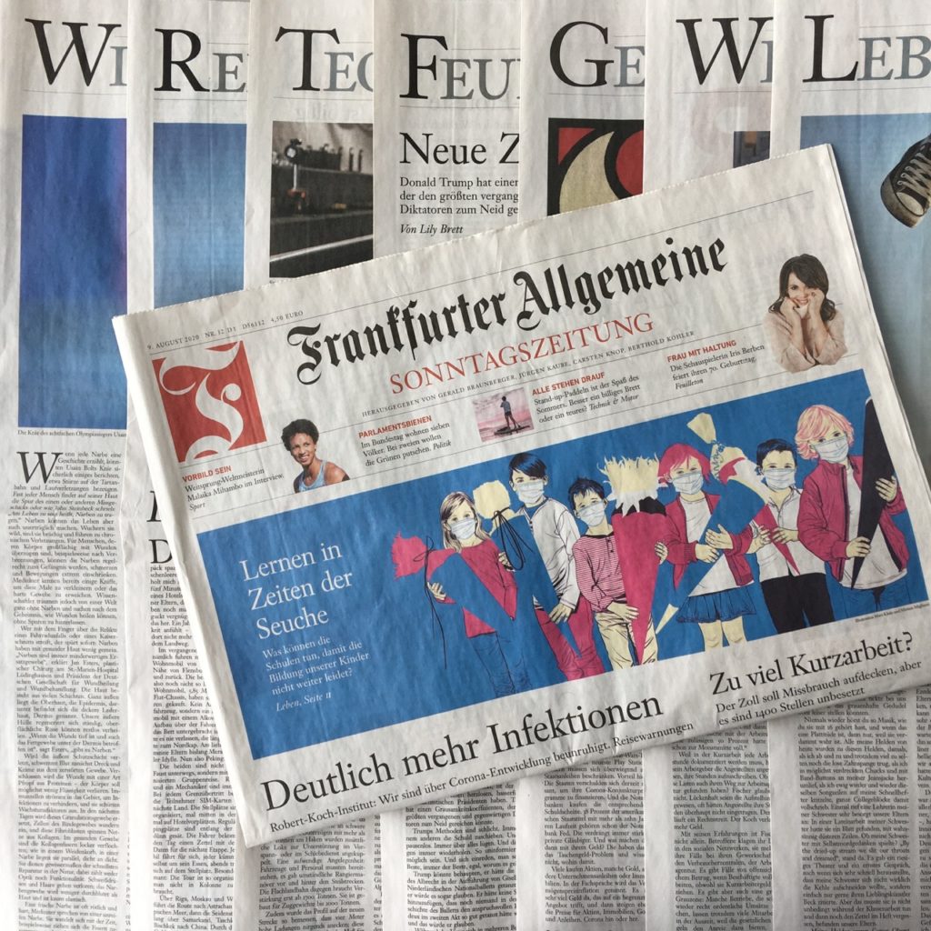 Die Ausgabe der Frankfurter Allgemeinen Sonntagszeitung (FAS) vom 9. August 2020 erschien mit einem Umfang von 56 Seiten verteilt auf 8 Bücher. Politik und Meinung finden sich im ersten Buch, Leben sowie Leib&Seele im zweiten Buch. Dann folgen Wirtschaft (3. Buch), Geld&Leben und Sport (4. Buch), Feuilleton und Medien (5. Buch), Technik&Motor und Beruf&Chance (6. Buch), Reise und Wohnen (7. Buch) sowie Wissenschaft (8. Buch). Im Vergleich zu den wochentags erscheinenden Zeitungen ist der größere Umfang und der reduziertere Politikteil hervorzuheben. Als Aufmacher fungierte am 9.8. eine querformatige, farbige Illustration von Mart Klein und Miriam Migliazzi, die Schulkinder mit Masken vor blauem Hintergrund zeigt. Der Titel „Lernen in Zeiten der Seuche“ verweist auf einen Artikel in der Rubrik Leben auf Seite 11.