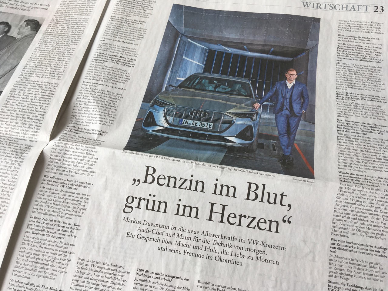 Der Bildeinsatz der FAS spiegelt den selbstgesetzten feuilletonistischen Anspruch des Blattes wieder. So finden sich gut wie keine klassischen Nachrichtenbilder. Stattdessen wird eher abstrakt und durchaus ungewöhnlich illustriert. Einen Artikel über die Welt der Corona-Querdenker im Politikteil auf Seite 7 illustrieren freigestellte und von Lucas Bäuml fotografierte Aluhüte. Screenshots begleiten einen Artikel auf Seite 2 zur Bildpraxis einiger Bundestagsabgeordneten auf Instagram während des Sommerurlaubs. In Rubriken wie Leben dominieren hingegen Stockfotografien von Agenturen wie Plainpicture, Shutterstock oder Vario Images. Auffallend ist auch die prominente Nutzung eines PR-Bildes der Automarke AUDI, das den Vorstandsvorsitzenden der Automarke zeigt, und vierspaltig ein Interview mit dem Konzernchef illustriert. Das Bild lässt sich für Pressezwecke honorarfrei von der Webseite des Autobauers herunterladen.