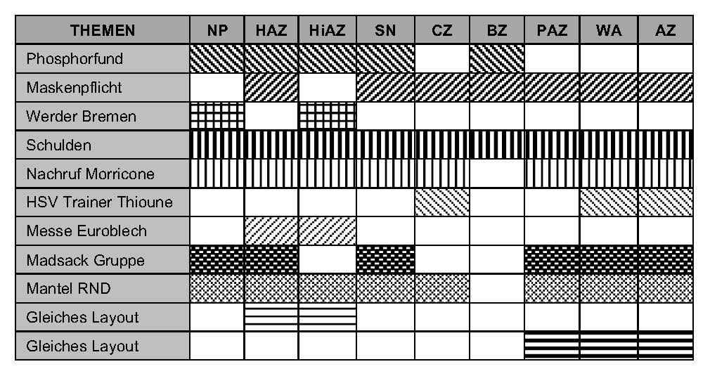 Vergleicht man in Bezug auf den Inhalt die Titelseiten nicht nur im gefalzten Format, sondern in voller Seitengröße, kristallisieren sich einige Gemeinsamkeiten wie auch Unterschiede heraus. So haben alle neun Zeitungen den niedersächsischen Haushalt und die dortige Schuldenpolitik auf der Titelseite. Auch der Tod von Ennio Morricone taucht noch in 8 von 9 Zeitungen auf, wenn auch immer ausschließlich auf der unteren Zeitungshälfte. Drittwichtigstes Thema ist die Debatte um die Maskenpflicht. Andere Themen wie das Relegationsspiel von Werder Bremen, ein neuer HSV Trainer oder die Messe Euroblech haben eine recht selektive Verteilung. Gestalterisch gibt es zwei mehrfach auftauchende Layoutraster. Einmal das von HAZ und HiAZ und andererseits das von PAZ, WA und AZ. Grundsätzlich zeigt sich bezogen auf die Inhalte sehr klar, dass auf den Titelseiten der Lokalzeitungen lokale und regionale Themen führend vor nationalen Themen sind. Internationale Nachrichten tauchen so gut wie gar nicht auf.