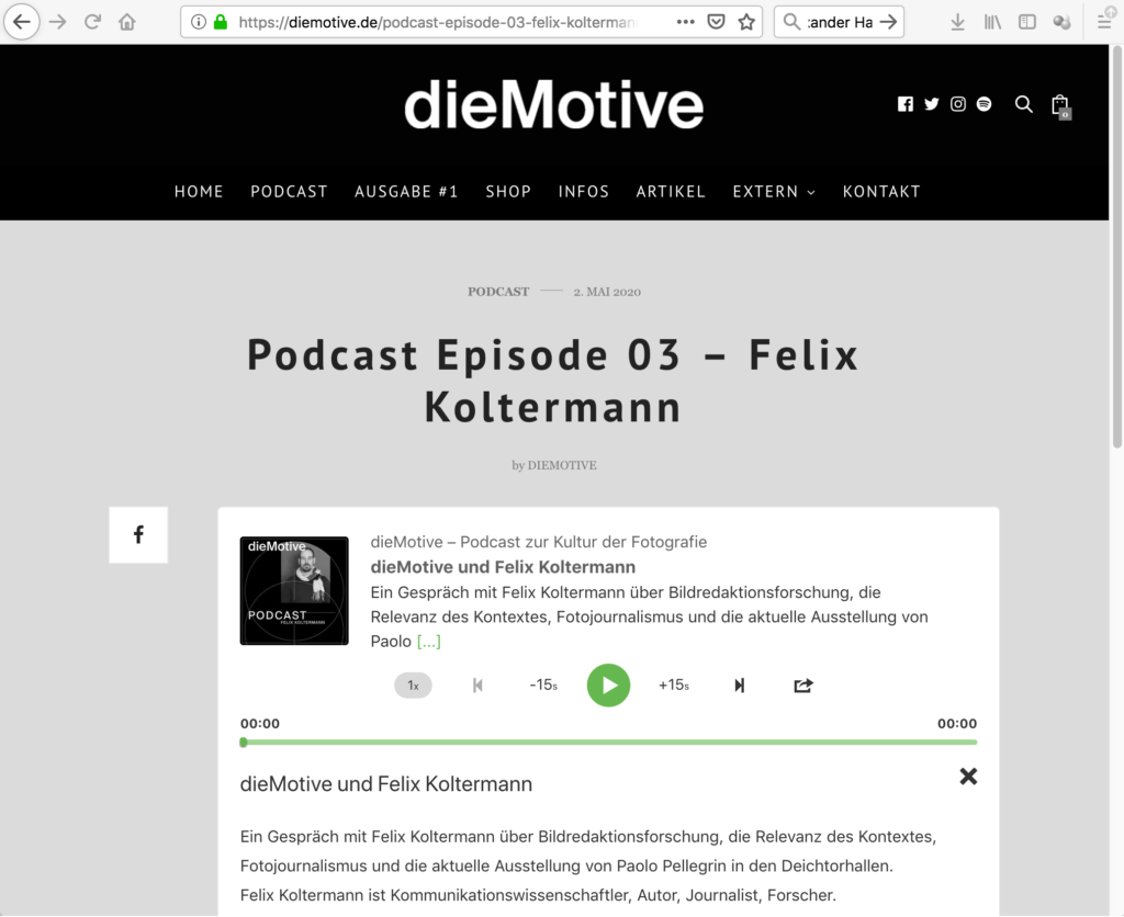 Im Interview mit Alexander Hagmann, Gründer und Herausgeber der Fotografiezeitschrift „Die Motive„, hat Dr. Felix Koltermann über die Hintergründe zu seinem Forschungsprojekt und Fragen der Kontextualisierung von Fotografie im Journalismus gesprochen. Der Podcast ist auf verschiedenen Plattformen sowie der Webseite der Zeitschrift anzuhören.
