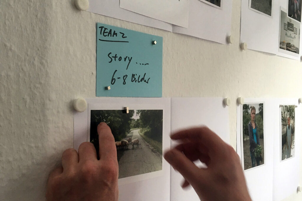 Den Einstieg ins praktische Arbeiten und Ausprobieren gelingt über eine Übung zum Storytelling. Der Auftrag ist, in drei Kleingruppen ca. 50 Bilder einer Fotografin zu einem bestimmten Themenkomplex – den wir jedoch nicht kennen – auf 6 bis 8 Bilder für drei Printdoppelseiten zu reduzieren. Im Fachjargon läuft solch eine Tätigkeit unter den Begriffen Editing oder Sequenzing. Keine so leichte Aufgabe, wie sich herausstellt. Denn beim Versuch, eine Geschichte nur über das zu erzählen, was sich aus den Bildern erschließen lässt, zeigt sich, wie Kontextabhängig Bilder sind. Da verwundert es kaum, dass nachher drei komplett unterschiedliche Serien an der Wand hängen. Deutlich wird die Schwierigkeit ein gutes Edit zu erstellen und Material sinnvoll – im Sinne der Geschichte – zu reduzieren.